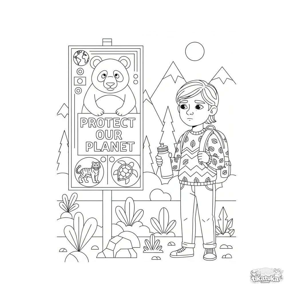Ausmalbild für Kinder 10-12: Ein Informationsschild über bedrohte Tierarten im Zoo. Szene über Naturschutz.