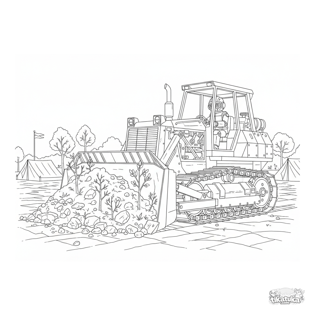 Technisches Ausmalbild für 10-12 Jahre: Ein Pionier-Bulldozer räumt Gelände für den Perimeter eines Feldhauptquartiers. Blaupausen-Stil, saubere Linien, viele Details.