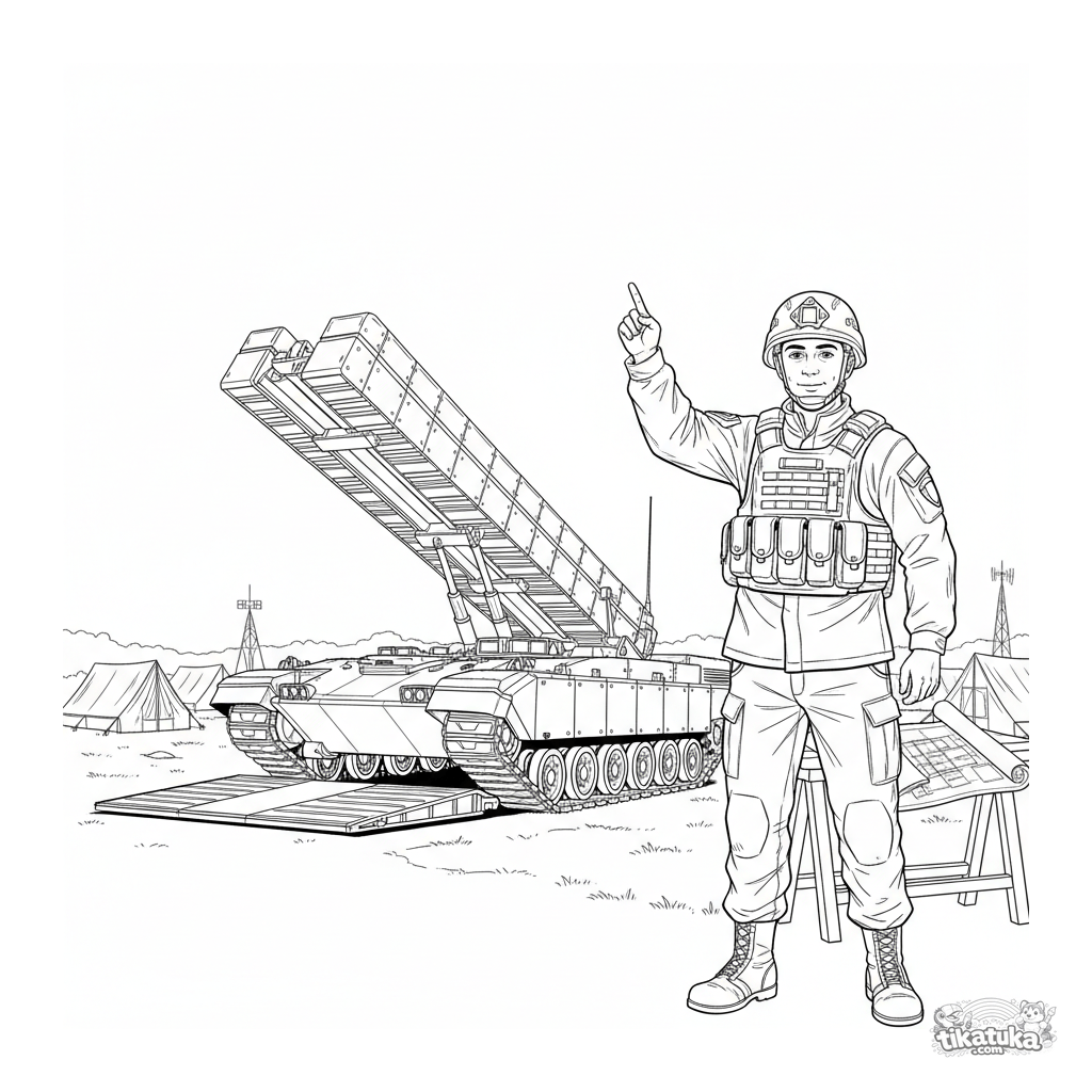 Komplexes Ausmalbild für 10-12 Jahre: Ein Ingenieur demonstriert einen leistungsstarken Brückenlegepanzer am Rand eines Feldhauptquartiers.