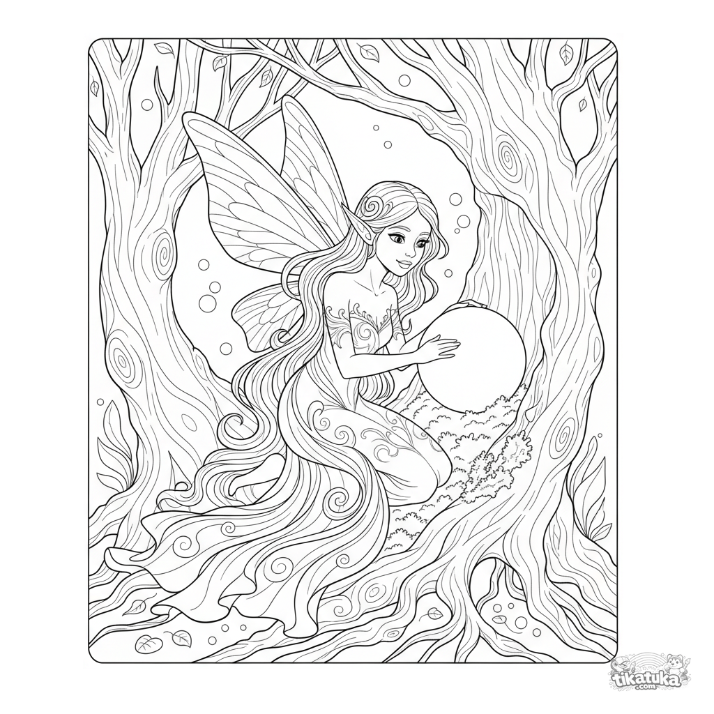 Detailliertes Art-Nouveau-Ausmalbild für ältere Kinder 10-12: Eine Fee poliert einen Mondstein in einer Baumhöhle.