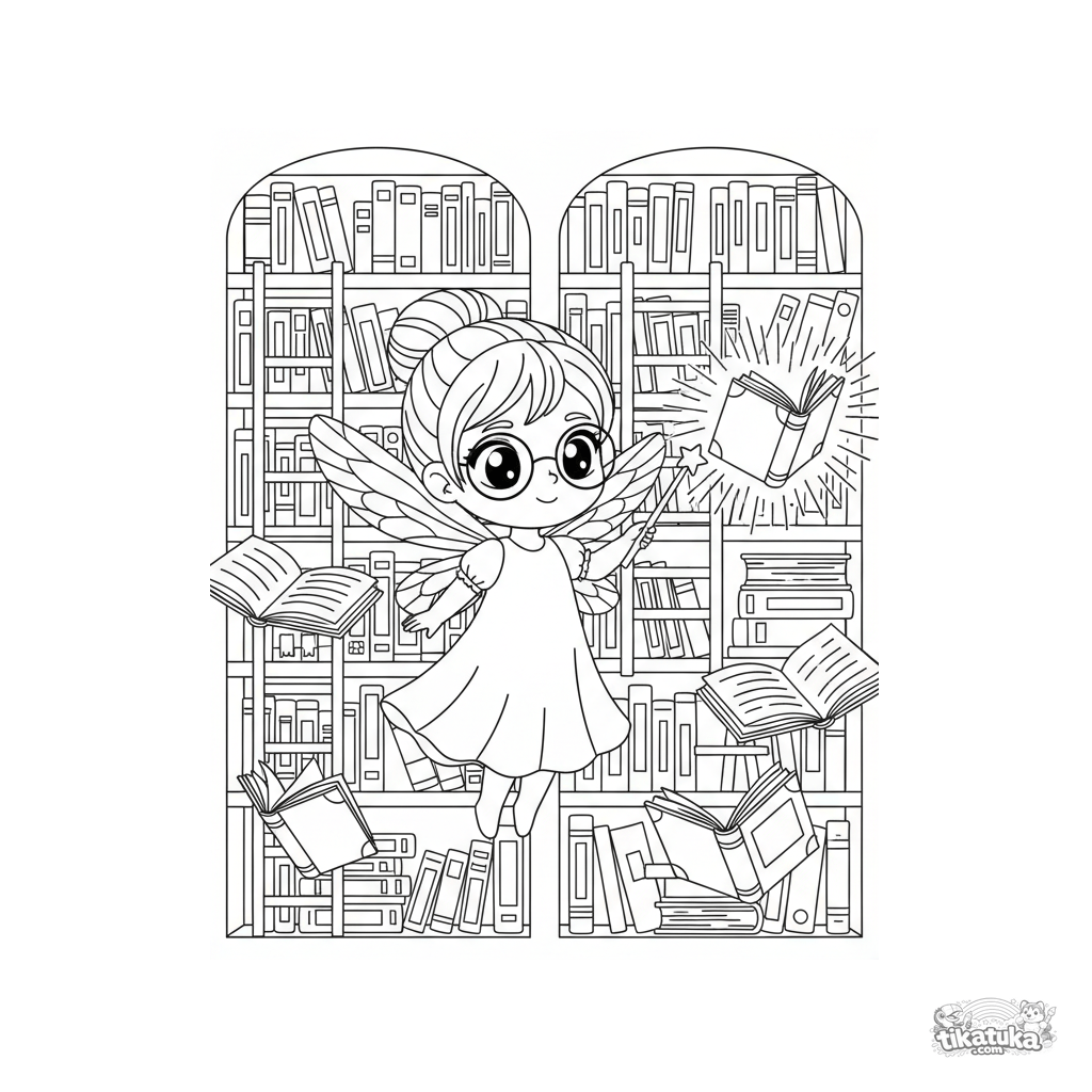 Ausmalbild für Tweens 7-9: Eine Feen-Bibliothekarin mit Brille ordnet leuchtende, flatternde Bücher in einer riesigen Zauberbibliothek. Fantasieszene mit charmanten Details.