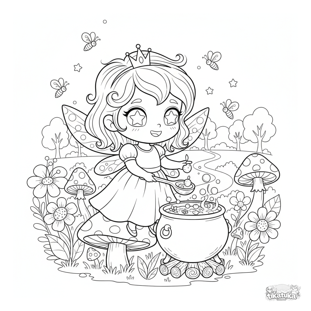 Ausmalbild für Kinder von 4-6 Jahren: Eine winzige Feen-Prinzessin mit Flügeln rührt einen Blütenblatt-Zaubertrank in einem Kessel im verzauberten Garten.