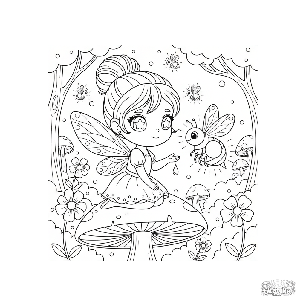 Ausmalbild für Kinder 4-6: eine winzige Feenprinzessin mit Flügeln zähmt ein großes Glühwürmchen auf einem Pilzhut in einer magischen Waldlichtung.