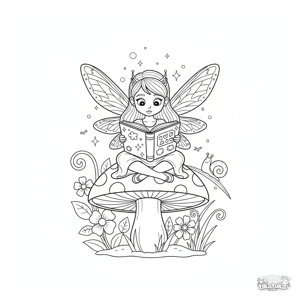 Ausmalbild einer Feenprinzessin, die ein Riesenmärchenbuch liest. Für Mädchen von 4-6 Jahren. Sie hat leuchtende Flügel und sitzt auf einem Fliegenpilz.