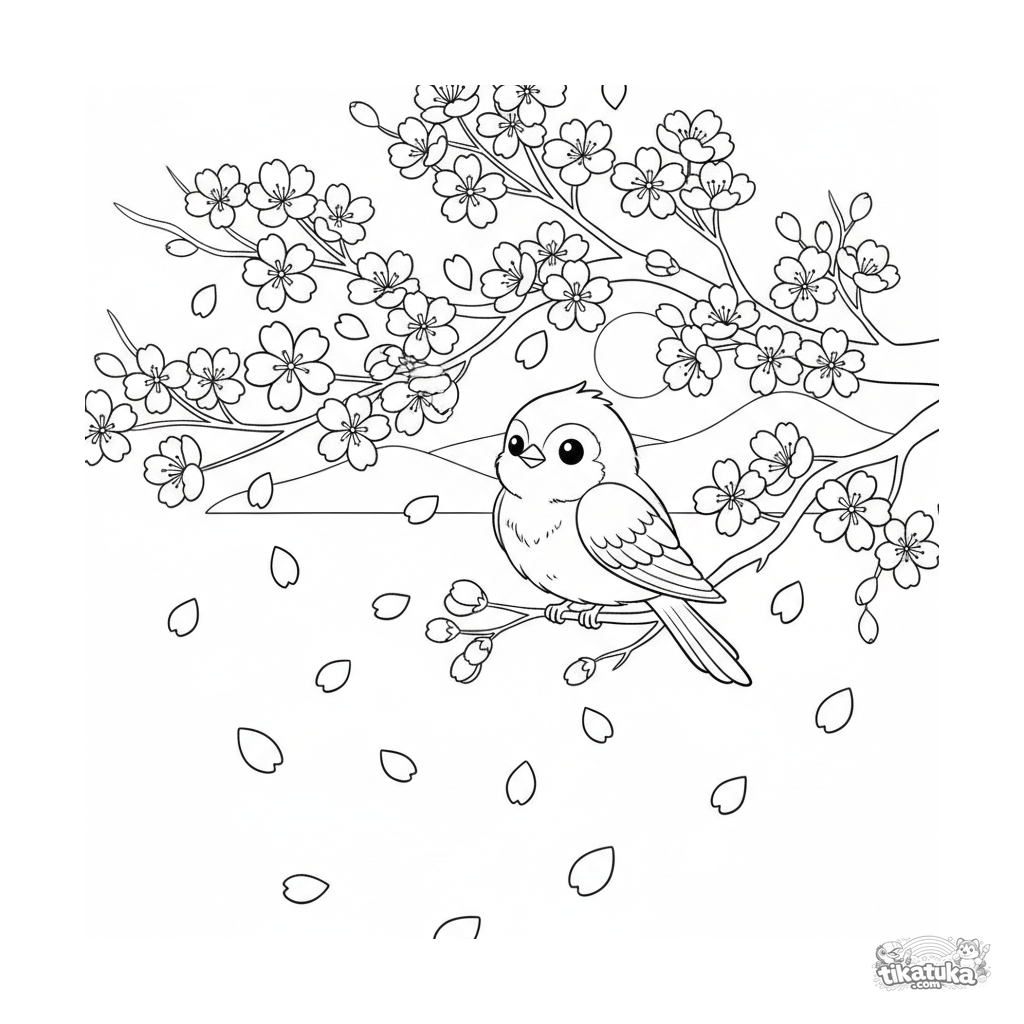 Kirschblütenzweig mit fallenden Blütenblättern und einem Vogel Ausmalbild für Kinder von 4-6 Jahren. Zarte Frühlingsszene im Paper-Cut-Stil.