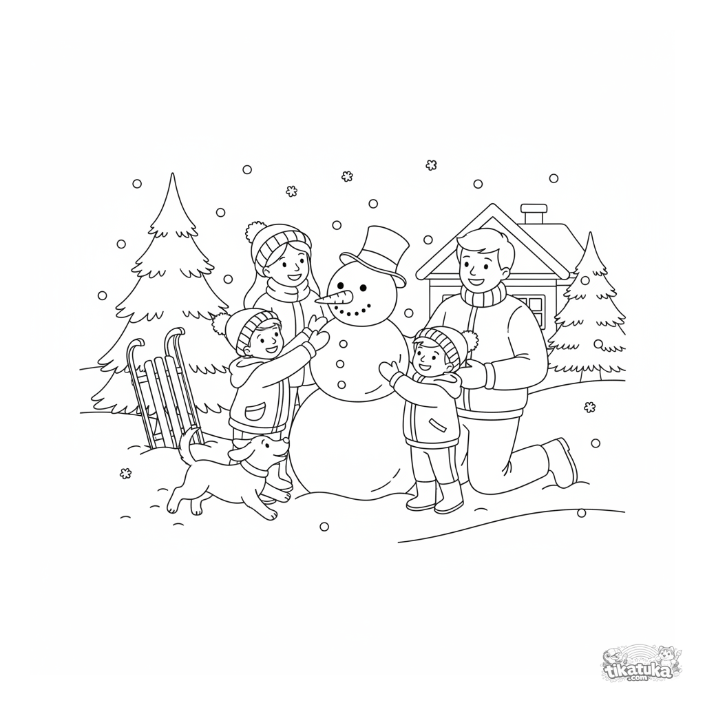 Winterliches Ausmalbild für Kinder 4-6: eine glückliche Familie baut einen Schneemann an einem sonnigen Tag. Realistischer Stil, viele Details zum Ausmalen.