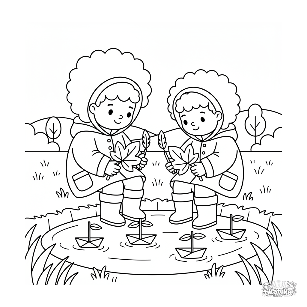 Ausmalbild für Kinder 4-6 Jahre: ein Elternteil und Kind in Regenkleidung bauen eine Blattboot-Flotte in einem Wassergraben. Volkskunststil, mäßige Details.