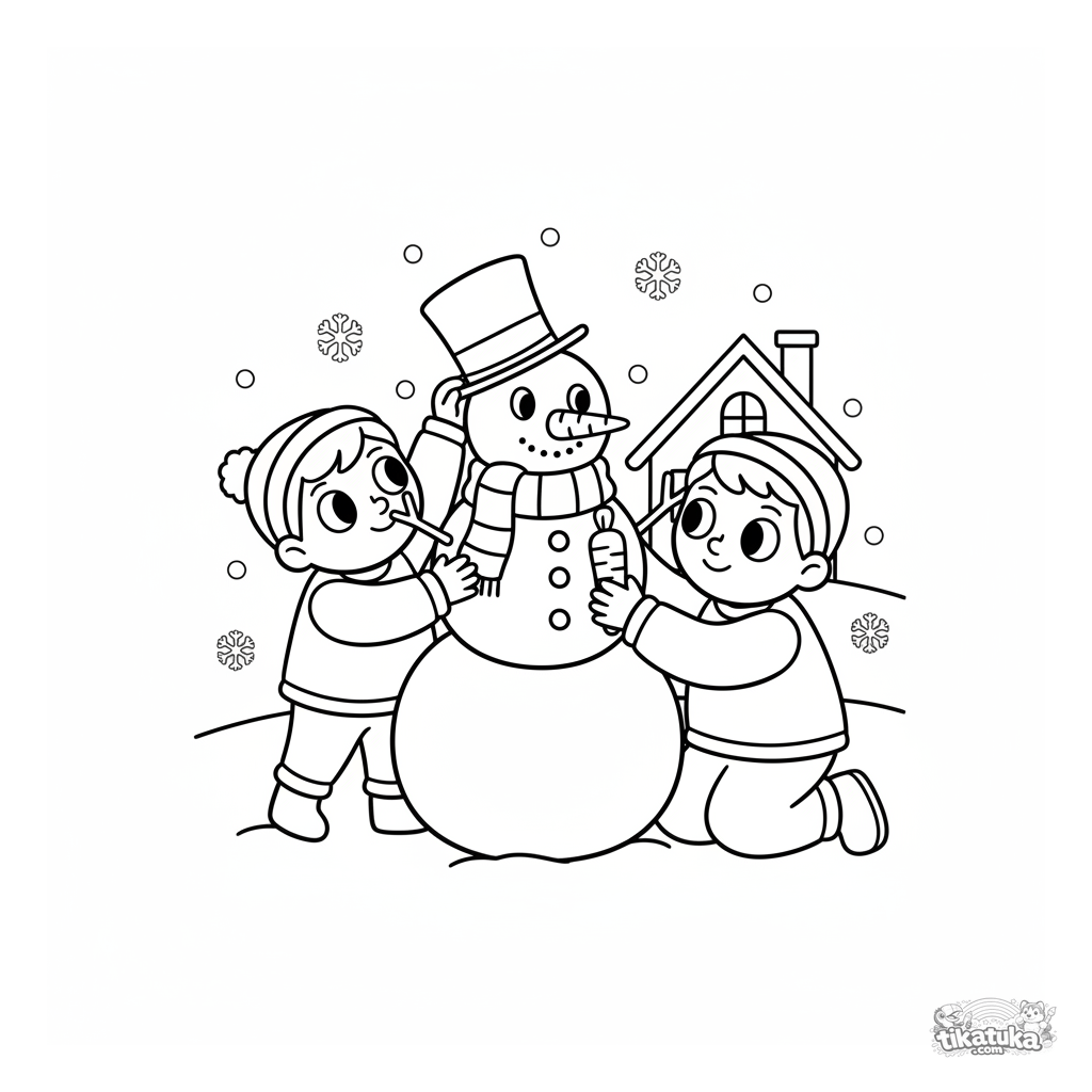 Winterliches Ausmalbild für Kinder 4-6: Eine glückliche Familie baut einen Schneemann mit Karottennase und Schal. Eine warmherzige Szene mit fallenden Schneeflocken.