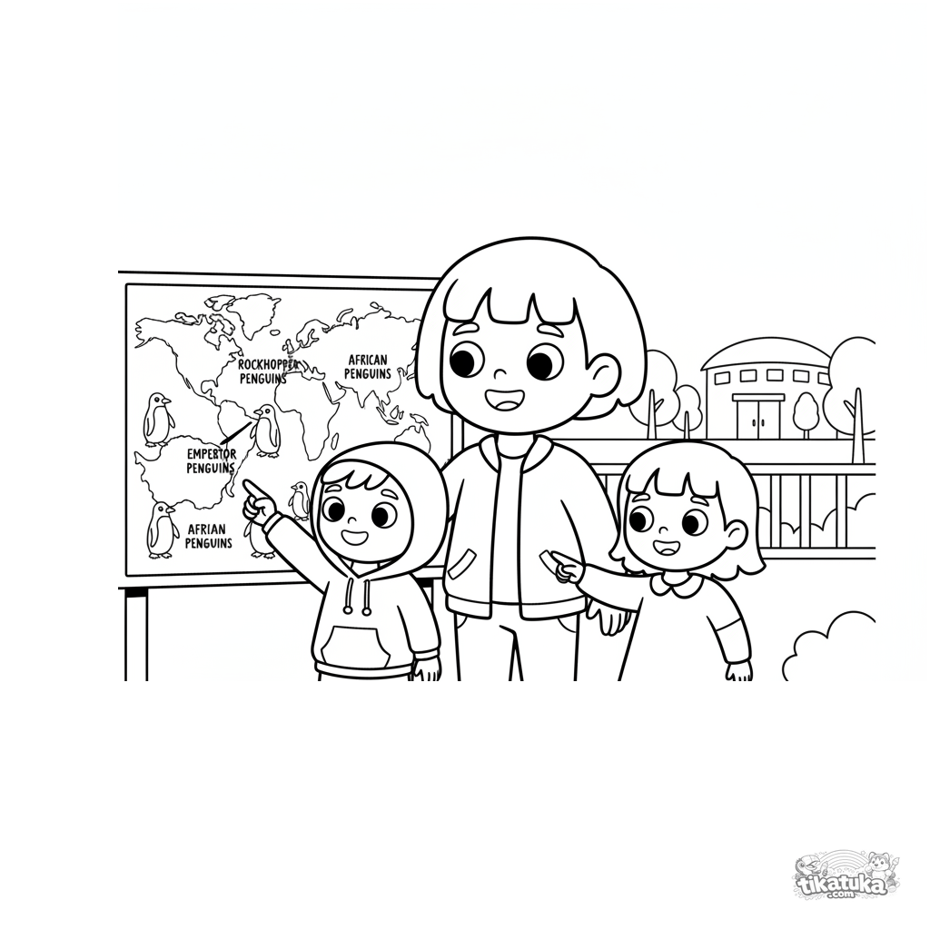 Ausmalbild für 7-9 Jahre: Eine Familie studiert eine große Karte verschiedener Pinguinarten und ihrer Lebensräume im Zoo. Lehrszene über Tiergeographie.