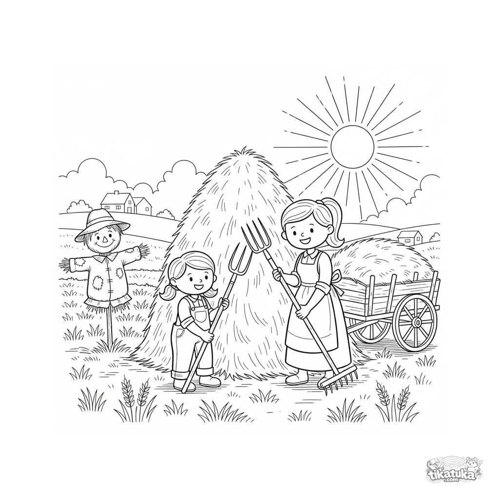 Kinder Ausmalbild: eine Familie in Arbeitskleidung baut gemeinsam einen großen Heuhaufen auf einem abgeernteten Feld mit Gabeln und Rechen.