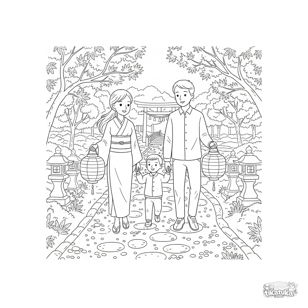 Kinder-Ausmalbild: eine Familie mit Papierlaternen geht an einem Herbstabend durch einen Garten zu einem Schrein. Kostenlose druckbare Seite, geeignet für 4-6 Jahre.