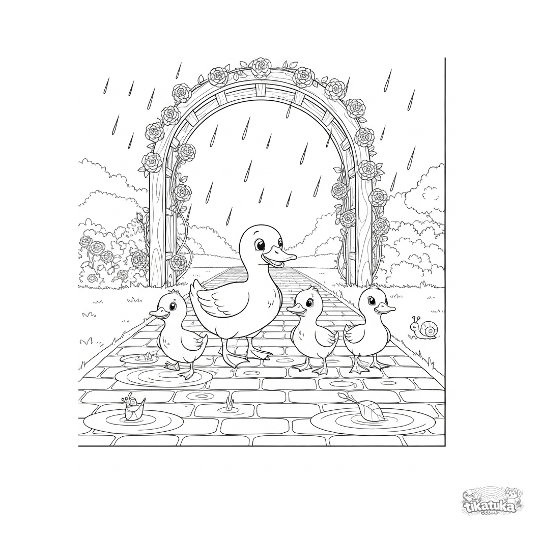 Ausmalbild einer Entenmutter mit Küken, die nach dem Regen einen Gartenweg überqueren. Für Kinder von 5 bis 8 Jahren.