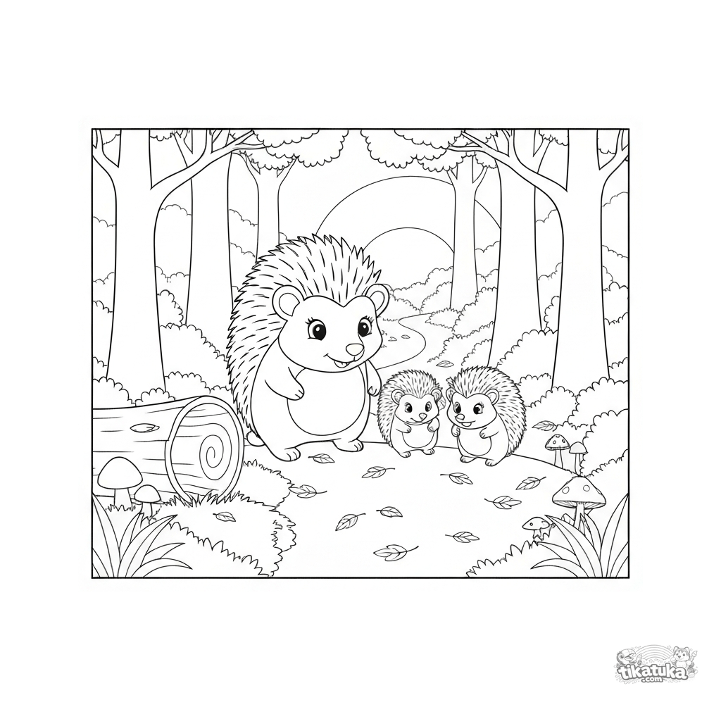 Ausmalbild einer Igel-Familie auf einem Herbst-Waldweg in der Dämmerung. Für Kinder von 5-8 Jahren. Zeigt eine Mutter-Igel, Igeljunge, Herbstblätter, einen Baumstamm und Pilze.