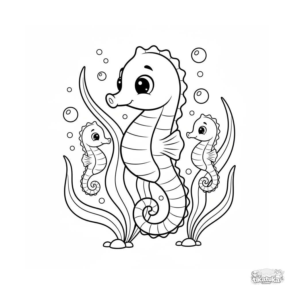 Einfaches Ausmalbild für Kleinkinder 2-3 Jahre mit einer Seepferdchen-Familie im Seegras. Große Figuren, dicke Umrisse, viel Freiraum.