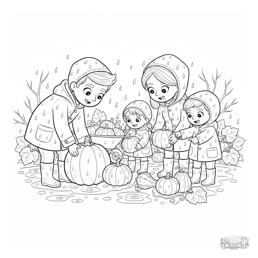 Detailliertes Ausmalbild für ältere Kinder 10-12 Jahre: eine Familie in Regenjacken pflückt Kürbisse auf einem nassen Herbstfeld. Mehrschichtige Szene, reicher Hintergrund, detaillierte Linienarbeit.