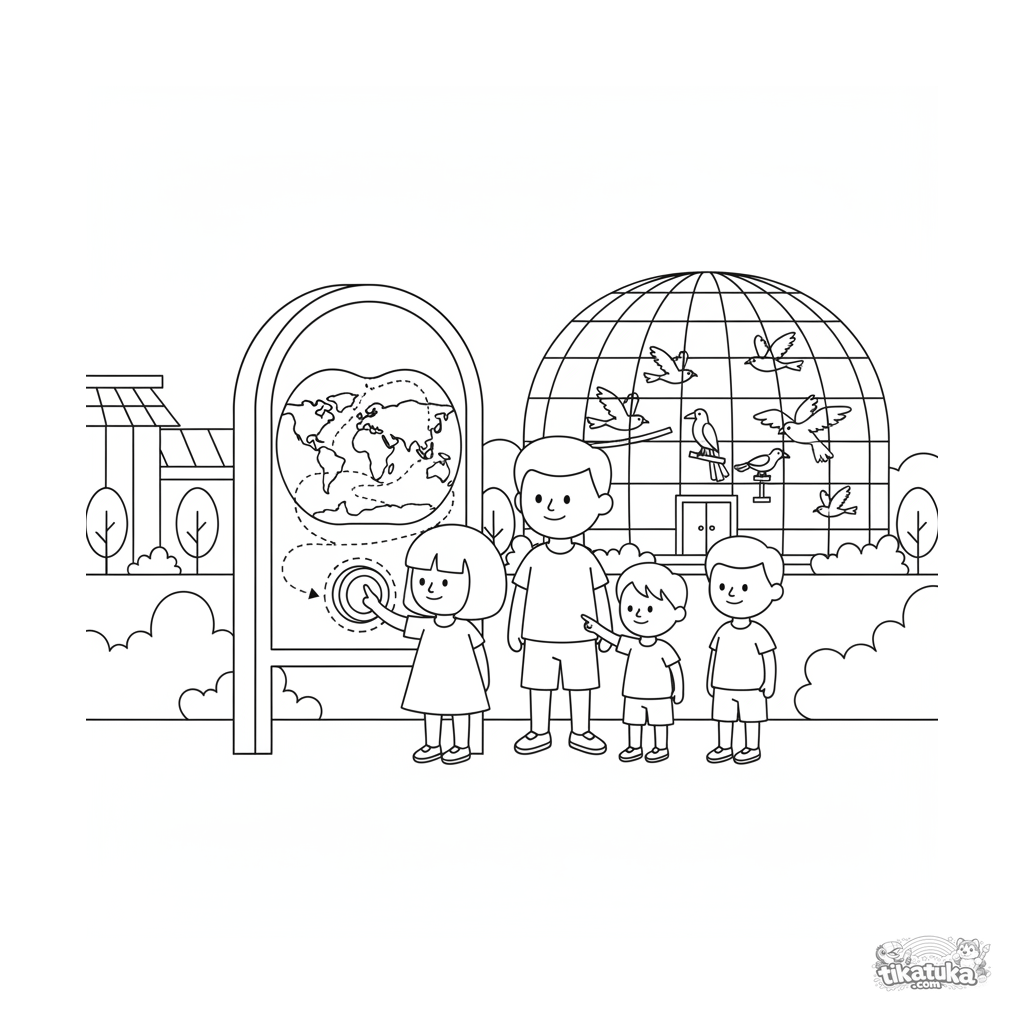 Ausmalbild für 7-9 Jahre: Eine Familie studiert eine große interaktive Vogelzugkarte an der Voliere im Zoo. Gruppen-Lehrszene über die Natur.