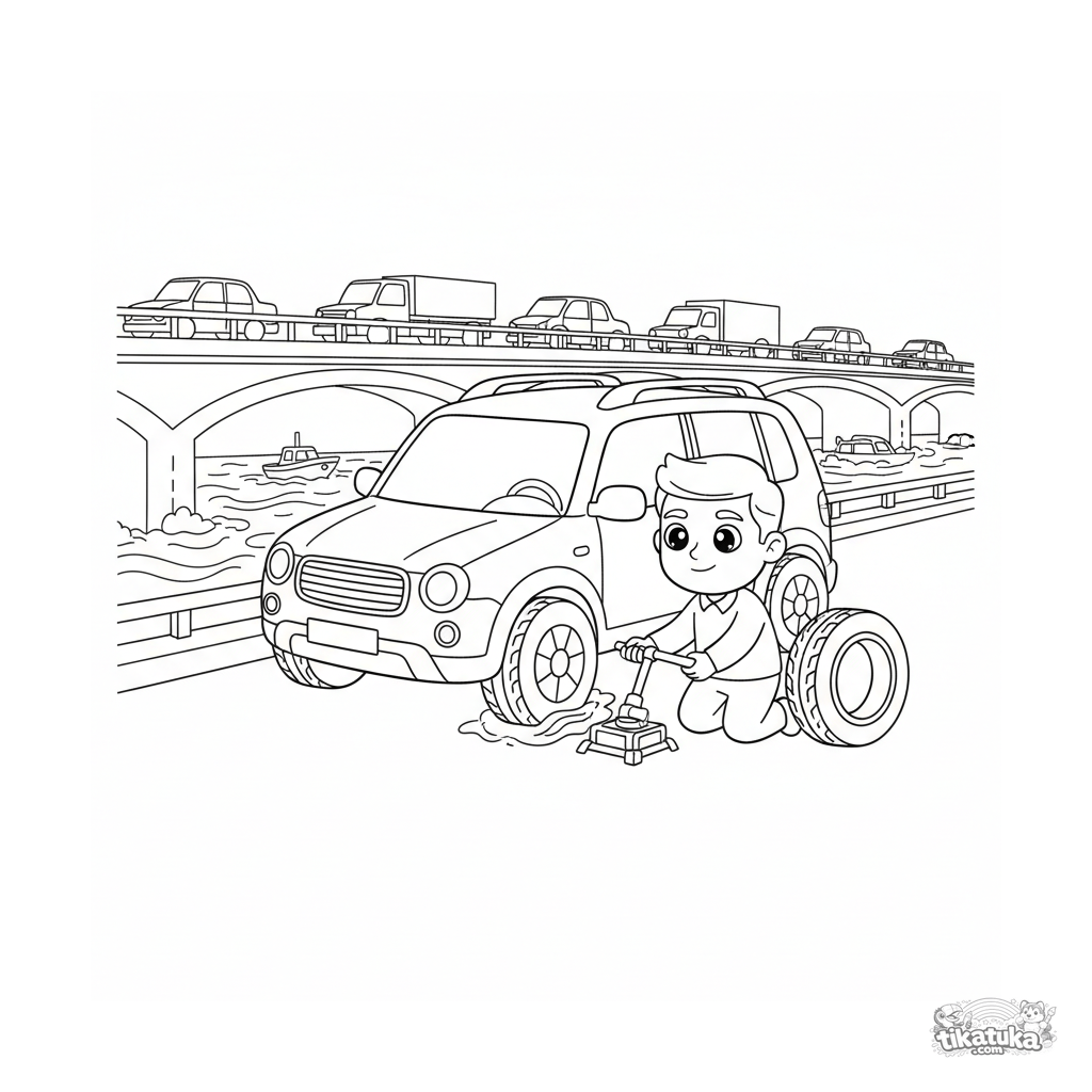 Ausmalbild für Kinder 4-6: ein Familien-SUV hat auf einer Brücke eine Reifenpanne. Papa wechselt das Rad, Fluss im Hintergrund.