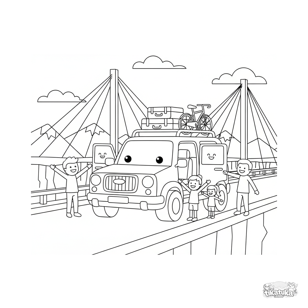 Ausmalbild für Kinder 4-6: Ein Familien-SUV mit einem Dachgepäckträger voller Gepäck hält an einem Aussichtspunkt auf einer hohen Brücke über einem Fluss-Canyon. Roadtrip-Szene.