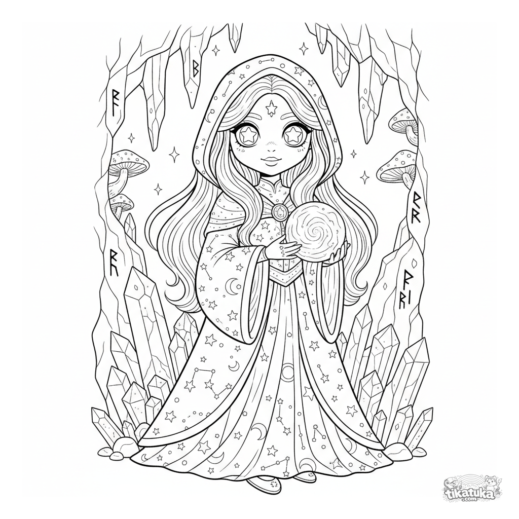 Ausmalbild für Mädchen 10-12: Eine Zauberin in einer detaillierten Sternenrobe in einer leuchtenden Kristallhöhle. Komplexer Fantasy-Hintergrund.