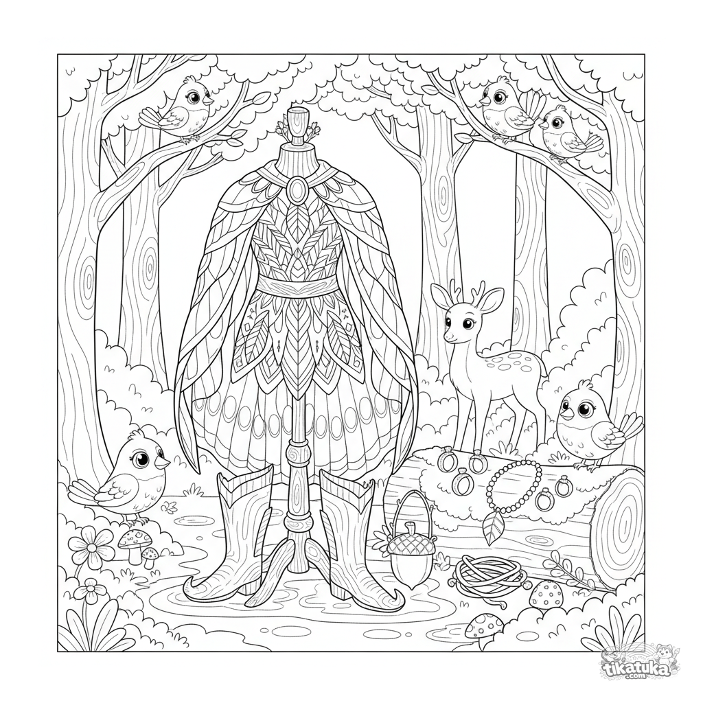 Ausmalbild für Mädchen 10-12: magisches Waldfeen-Outfit an einer Holz-Schneiderpuppe in einer sonnigen Lichtung. Viele natürliche Details und Accessoires.