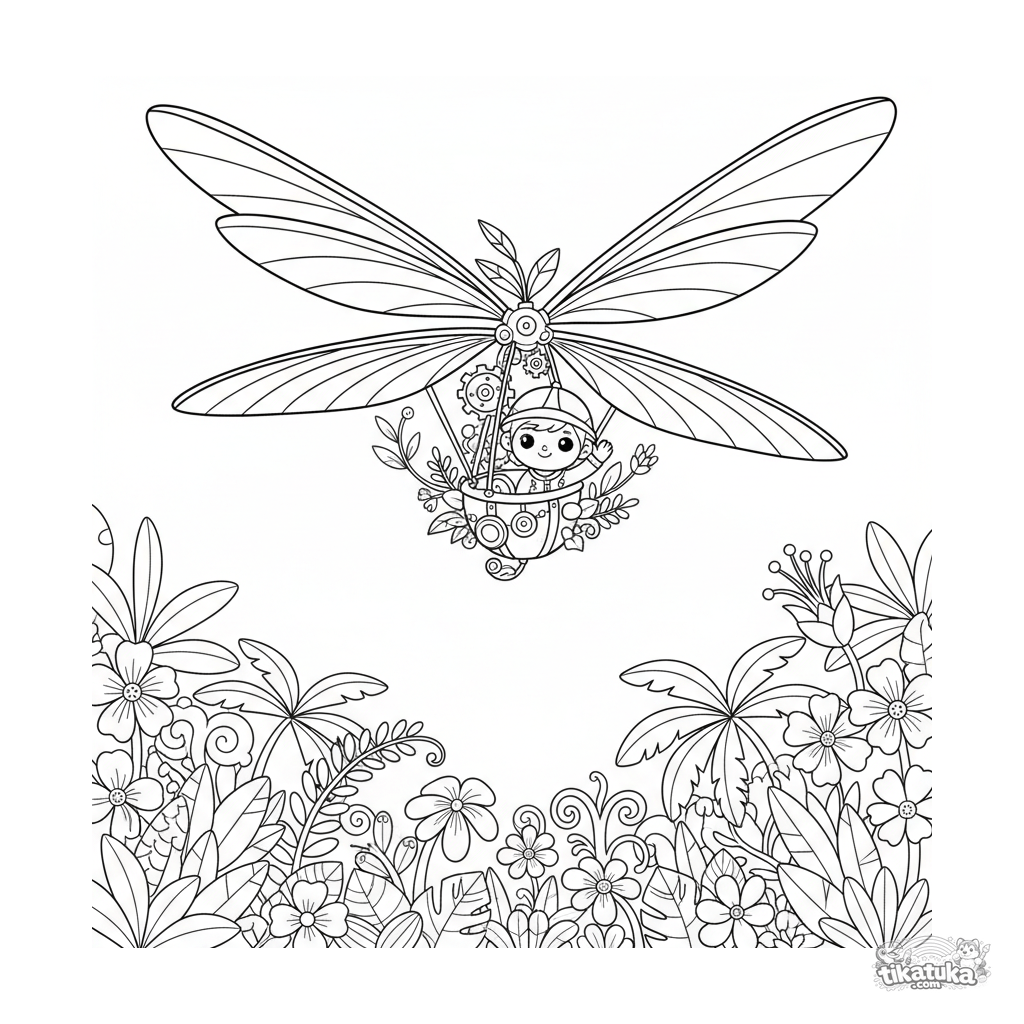 Ausmalbild eines Fantasy-Ornithopters mit schlagenden Flügeln, der über einen üppigen Dschungel fliegt. Fantasy-Stil Illustration für Kinder von 7-9 Jahren.