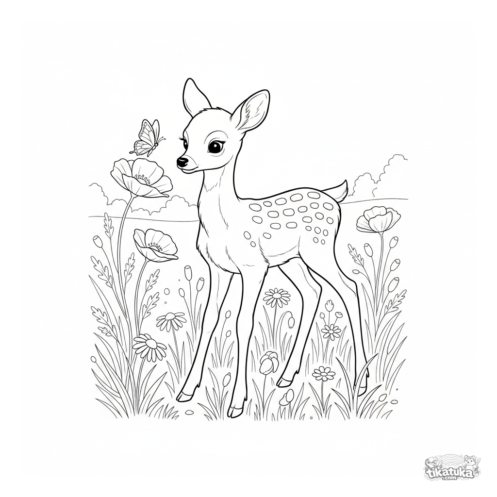 Ausmalbild für Kinder 4-6: ein geflecktes Rehkitz erkundet vorsichtig eine Frühlings-Wildblumenwiese mit Schmetterlingen. Ganzer Körper sichtbar.