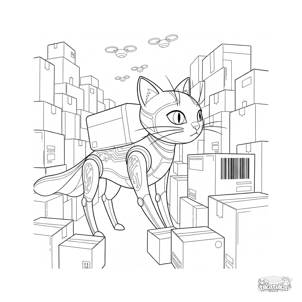 Komplexes Ausmalbild für ältere Kinder 10-12: Ein realistischer katzenförmiger Roboter mit Schnurrhaarantennen bahnt sich seinen Weg durch ein Labyrinth aus Kartons in einem riesigen Lagerhaus und scannt einen Strichcode.