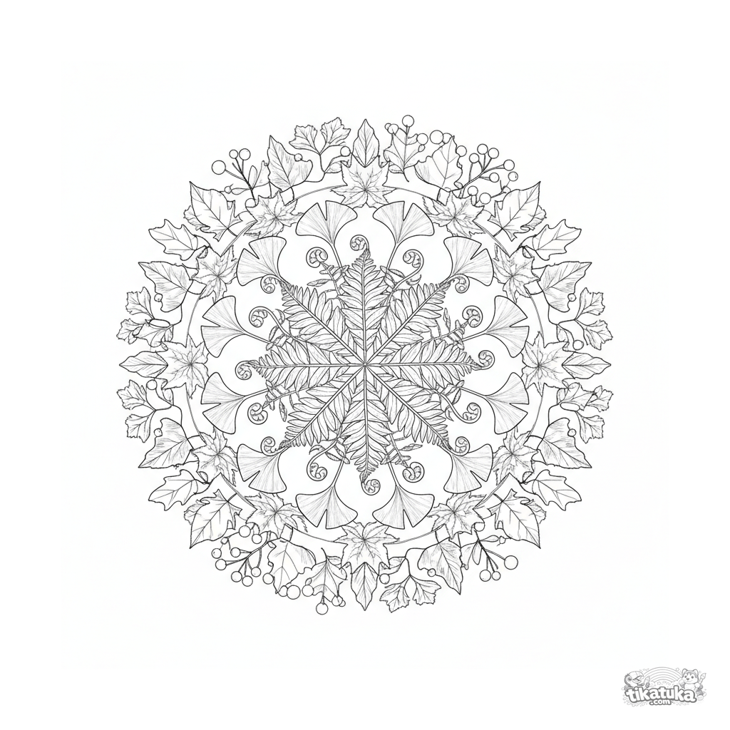 Detaillierte botanische Mandala mit einem zentralen Farn, umgeben von Ringen verschiedener Blatttypen und Samenkapseln. Komplexes Ausmalbild im Stil einer wissenschaftlichen Illustration für 10-12 Jahre.