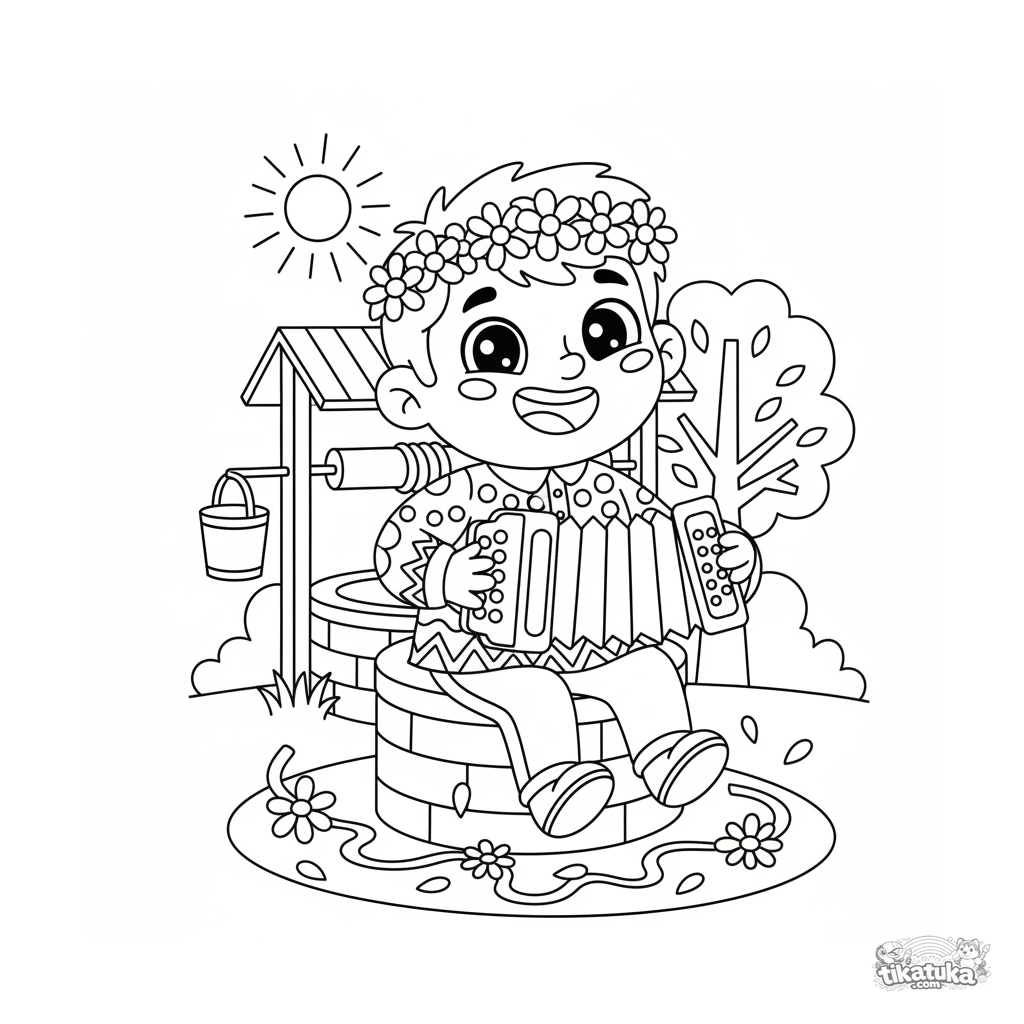 Ausmalbild für Kinder 4-6: Ein fröhlicher Musiker mit Blumenkrone spielt Akkordeon am Brunnen des lebendigen Wassers während eines Festes. Helle Szene im Paper-Cut-Stil mit Bändern und Blumen.
