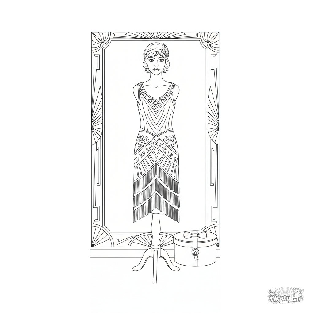 Detailliertes Feldhandbuch-Stil Ausmalbild für Mädchen 10-12: Ein 1920er Flapper-Kleid auf einem Schaufensterpuppe in einem Art-Deco-Boutiquenfenster.