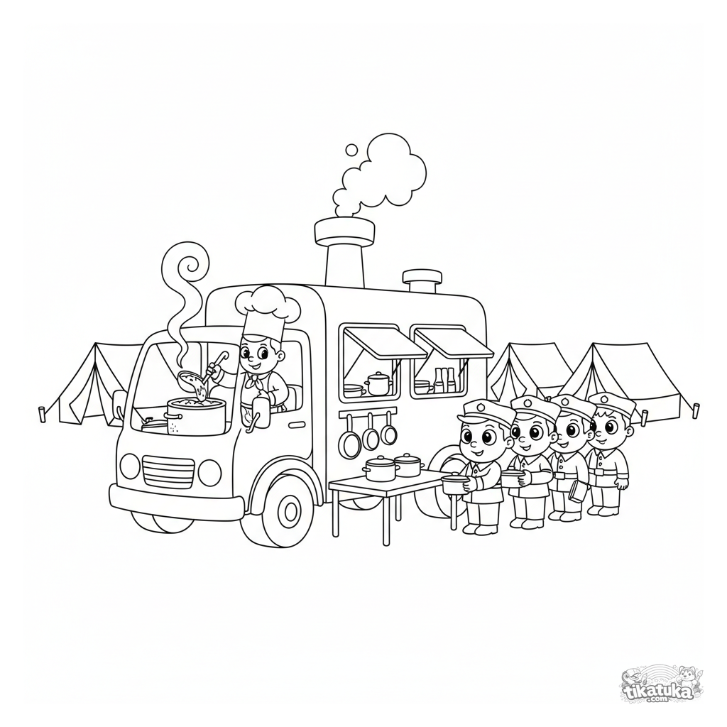 Ausmalbild für Kinder 7-9: Ein freundlicher Feldküchen-LKW serviert Soldaten am Feldhauptquartier Essen. Der Koch schöpft Eintopf, eine Schlange bildet sich.