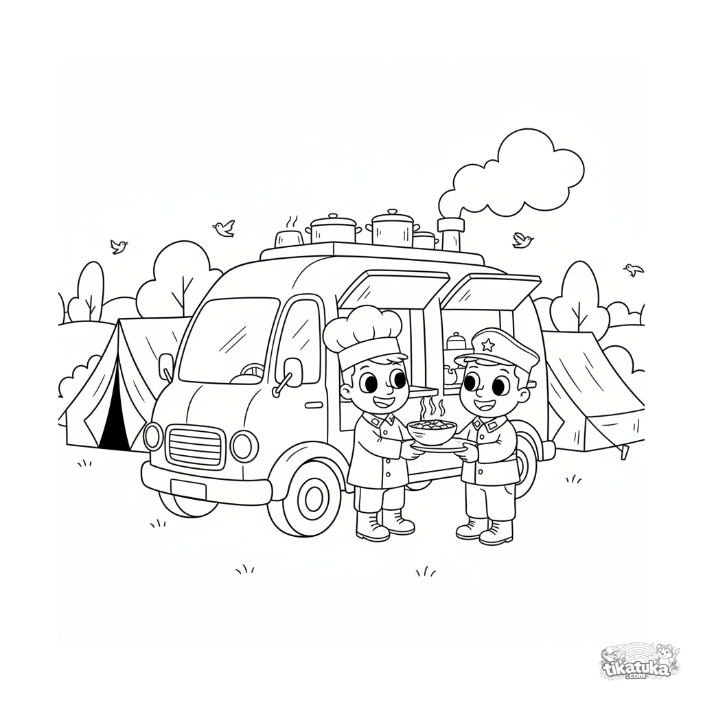 Ein Ausmalbild zum Thema Militärfahrzeuge mit Detailgrad Mittel. Es passt für das Alter 4-6 Jahre, lässt sich gut zu Hause drucken und sofort online öffnen.