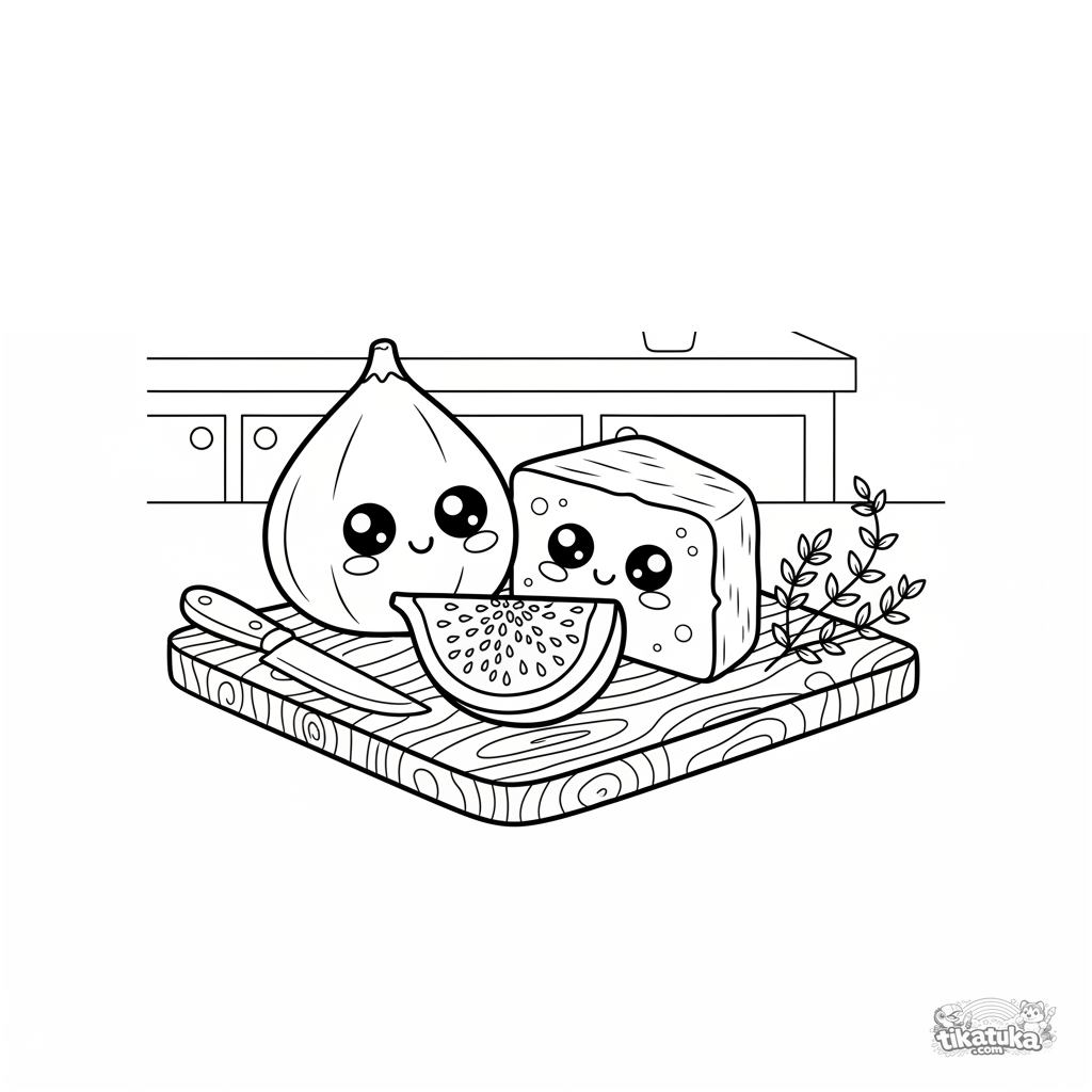 Stylisches Ausmalbild für 7-9 Jahre: eine geschnittene Feige und Ziegenkäse auf einem Holzbrett. Küchen-Stillleben im modernen Flat-Vector-Stil.