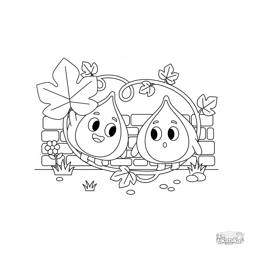 Ausmalbild mit zwei Feigen an einer Rebe, eine versteckt sich hinter einem Blatt. Für Kinder von 7-9 Jahren.