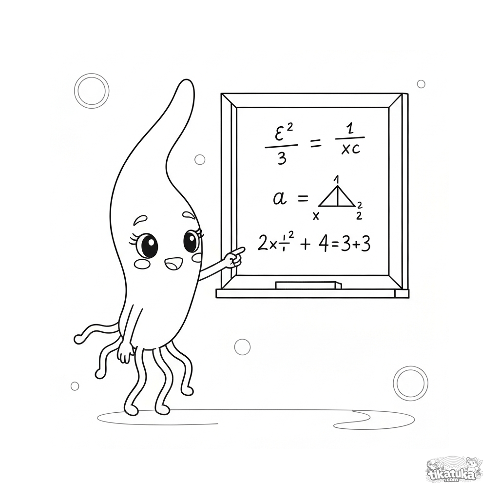 Ausmalbild für Kinder. Süßes fadenförmiges Bakterium mit Herzaugen unterrichtet Mathe an der Tafel. Studio Ghibli Stil. Kostenlos herunterladen.