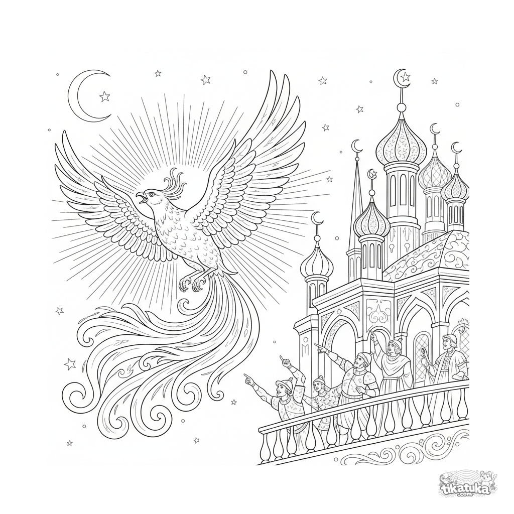 Ausmalbild mit dem Feuervogel, der über den Zarenpalast am Nachthimmel fliegt. Für ältere Kinder von 7-12 Jahren. Eine detaillierte und magische Szene aus einem russischen Märchen.