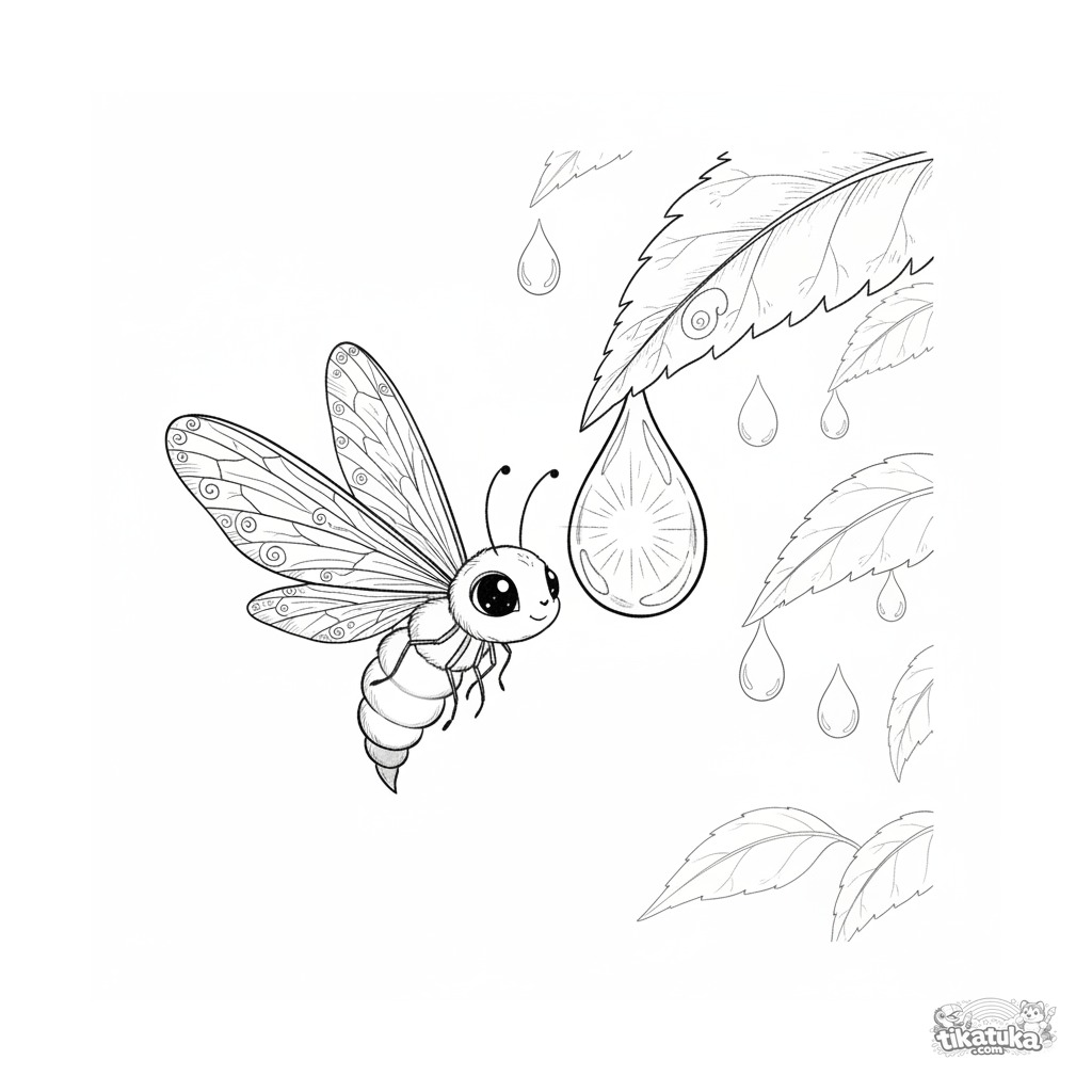 Komplexes Ausmalbild für ältere Kinder 10-12 im Aquarell-Skizzen-Stil: Das Leuchten eines Glühwürmchens erhellt einen hängenden Tautropfen von innen und schafft eine magische Nachtszene auf einem Blatt.