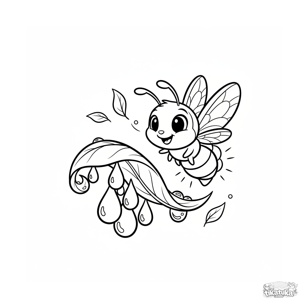Disney-Stil Ausmalbild für Kinder 7-9: Ein freundliches Glühwürmchen fliegt um Tautropfen und lässt sie wie kleine Laternen leuchten.