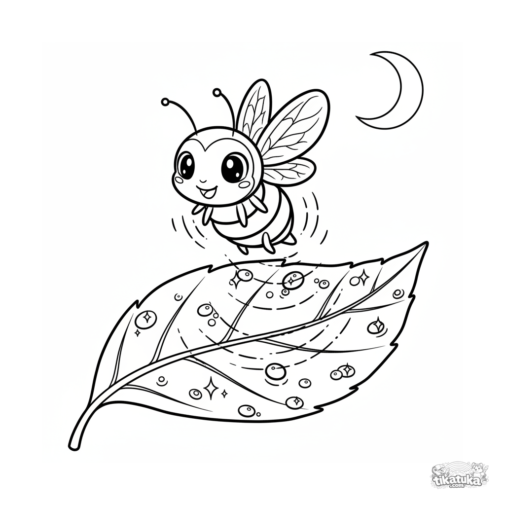 Ausmalbild für Kinder 4-6 Jahre: ein freundliches Glühwürmchen erleuchtet ein betautes Blatt bei Nacht. Anime-Kodomo-Stil, große ausdrucksstarke Augen, magische Nachtszene.