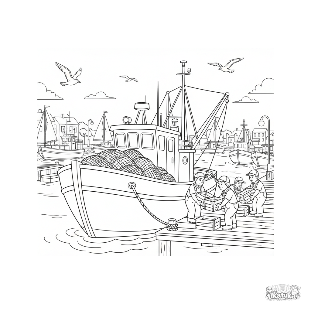 Ausmalbild für Kinder 7-9: Ein Fischtrawler lädt seinen Fang an einem Hafendock in der Dämmerung ab. Arbeitsatmosphäre, Möwen.