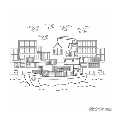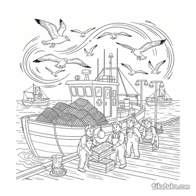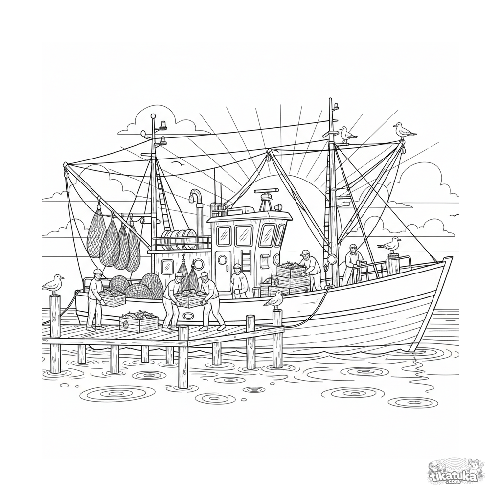 Detailliertes Ausmalbild für ältere Kinder 10-12: ein Fischtrawler entlädt den Fang am Kai bei Sonnenuntergang. Besatzung, Kisten, Netze und Möwen.