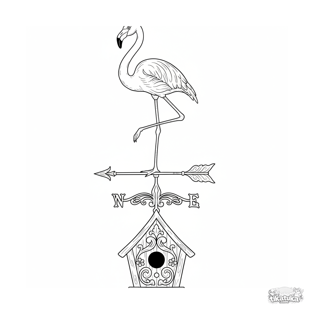 Stilvolles Ausmalbild für 10-12 Jahre im Art-Nouveau-Stil: ein eleganter Flamingo balanciert auf der Wetterfahne eines Vogelhauses. Fließende Linien.