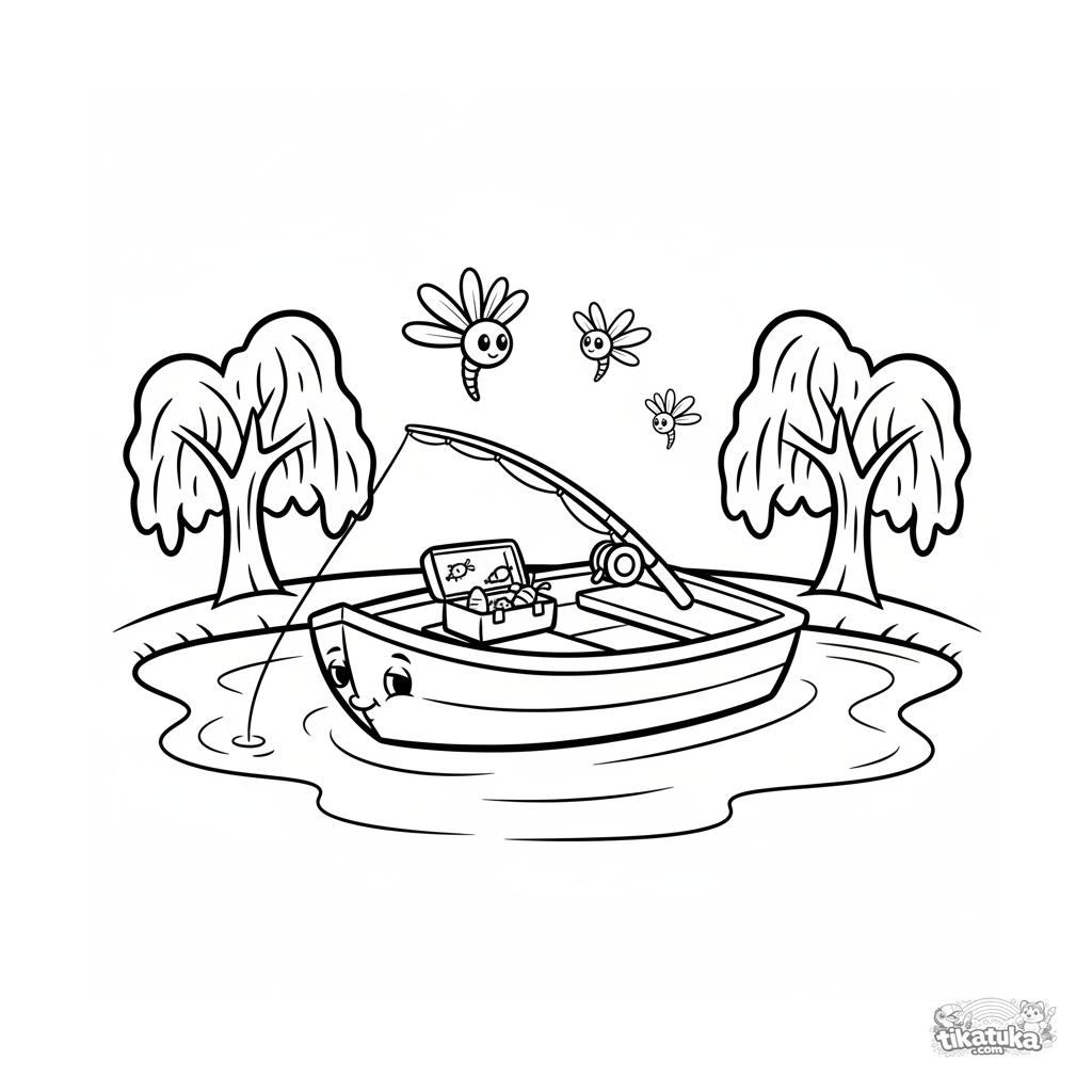 Einfaches Ausmalbild für Kleinkinder: ein Flachbodenboot liegt auf einem ruhigen Teich. Angelrute, Tackle-Box, Weidenbäume.