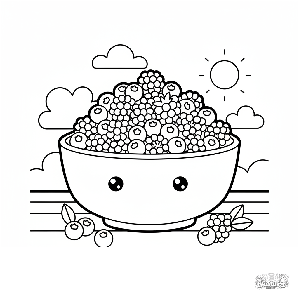 Ausmalbild für 4-6 Jahre: Eine einfache Keramikschale voller Himbeeren, Blaubeeren und Brombeeren. Saubere Umrisse, Flachvektor-Stil.