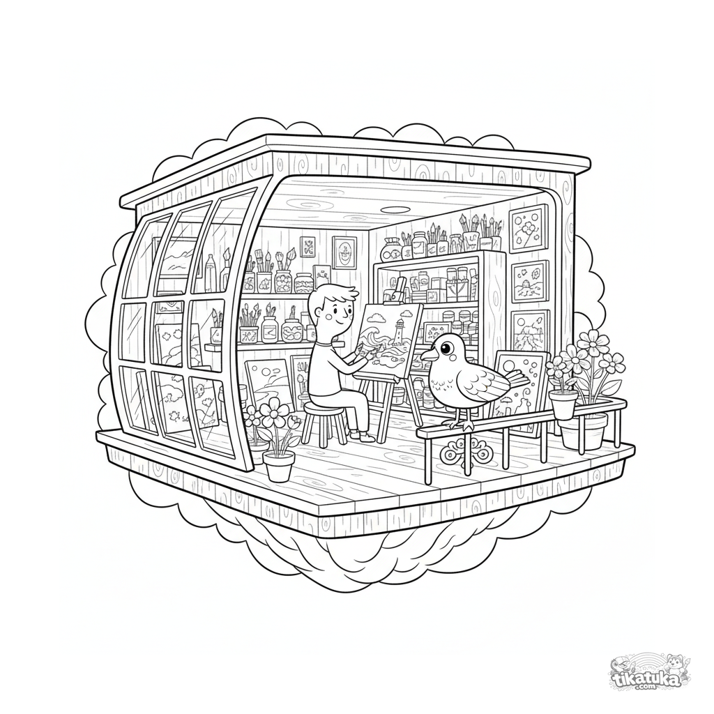 Ausmalbild: Ein schwimmendes Kunststudio auf einer geräumigen Meeresplattform für Kinder von 10-12 Jahren. Künstler an der Staffelei, Pinsel, Farben, Leinwände und Meerblick.