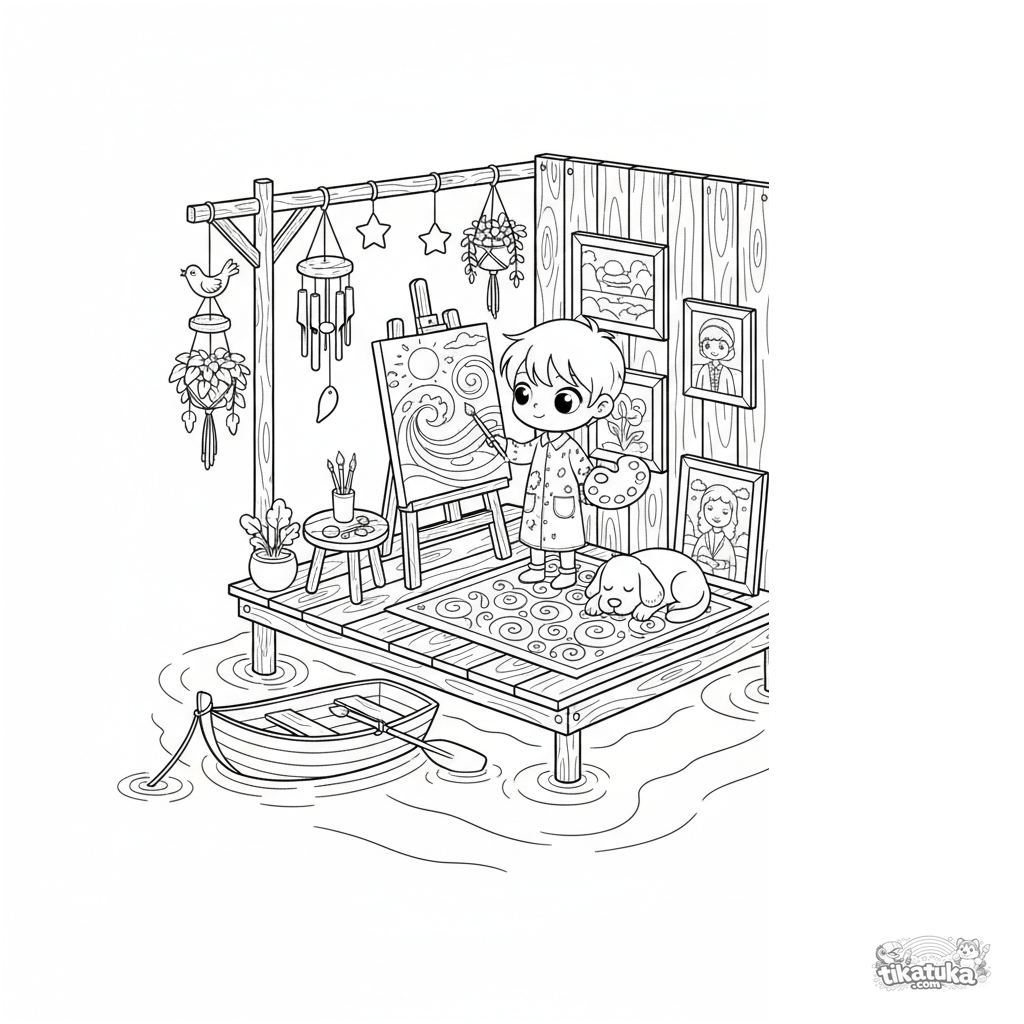 Detailliertes Ausmalbild für Kinder 10-12: ein kreatives schwimmendes Künstleratelier auf einer Holzplattform. Künstler an der Staffelei, Gemälde, Palette, Hund und eine friedliche Meeresaussicht.