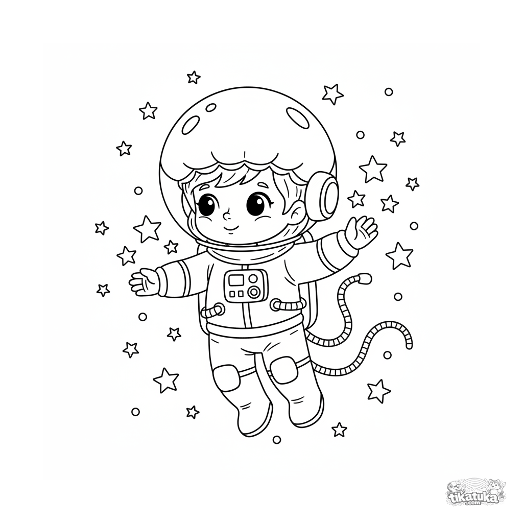 Ausmalbild für Kinder 4-6: Ein Astronaut mit einzigartigem Helm schwebt zwischen Sternen.