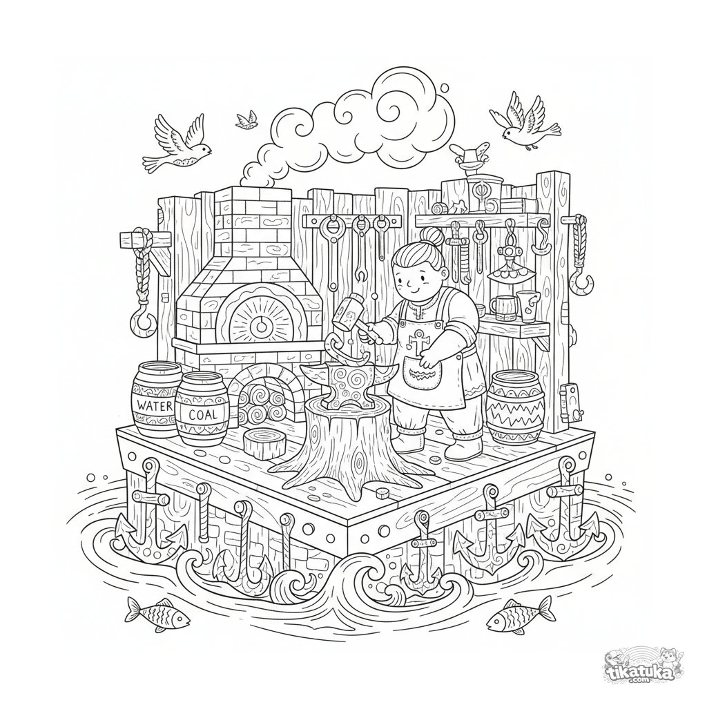 Ausmalbild einer schwimmenden Schmiedewerkstatt im Volks-Lubok-Stil für 10-12 Jahre. Details: Schmiedeofen, Amboss, Schmied mit Hammer, Werkzeuge, Fässer.