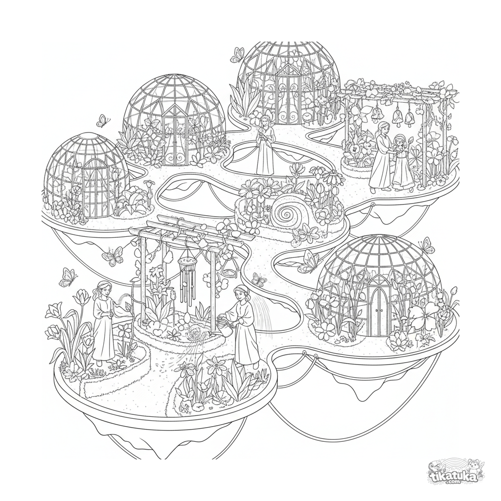 Ausmalbild: Ein detaillierter schwimmender botanischer Garten mit Gewächshäusern auf Meeresplattformen für Kinder von 10-12 Jahren. Mit Wegen, exotischen Pflanzen, Gärtnern und Schmetterlingen.