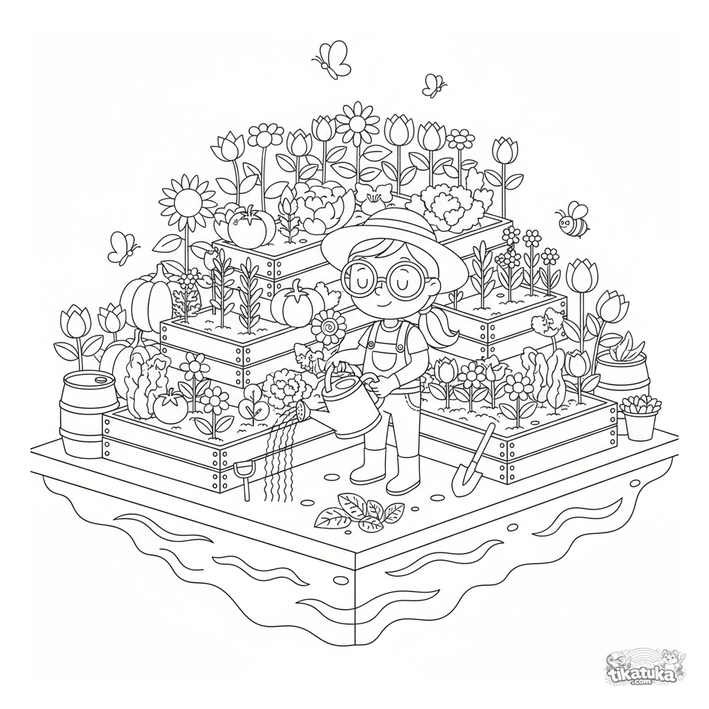 Ausmalbild für 10-12 Jahre: Ein üppiger schwimmender Garten. Detaillierte Szene mit Botaniker, Hochbeeten, Insekten und Werkzeugen zum kreativen Ausmalen.